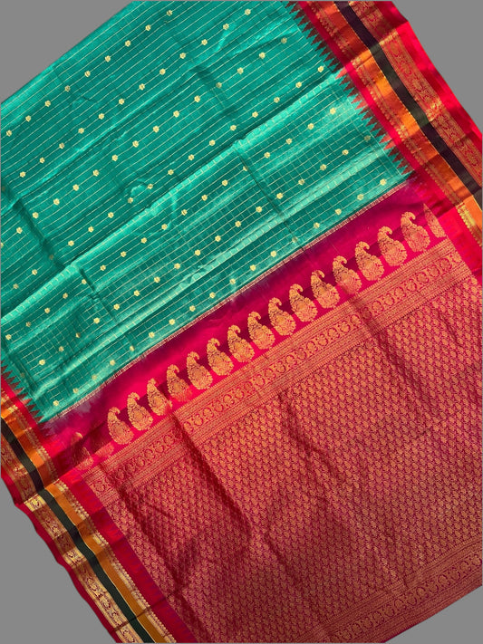 Bridal Big Checks Butta Peacock Blue Pure Silk Sarees