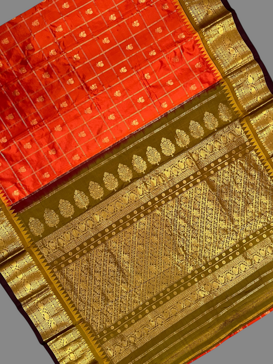 Bridal Big Checks Butta Orange Pure Silk Sarees