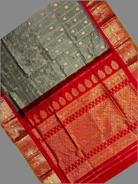Bridal Big Checks Butta Grey Pure Silk Sarees