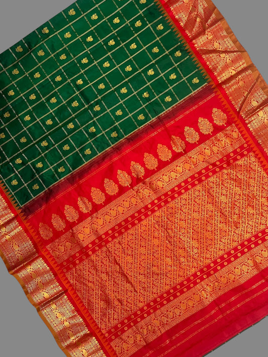 Bridal Big Checks Butta Green Pure Silk Sarees