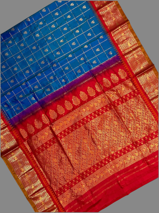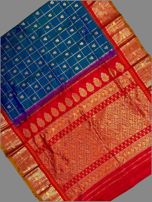 Bridal Big Checks Butta Peacock Blue Pure Silk Sarees