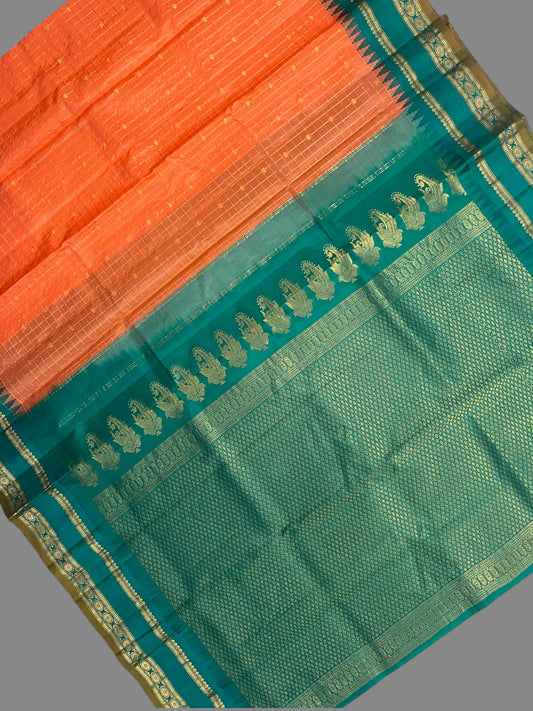 Gap Border Checks Peach Orange Pure Silk Saree