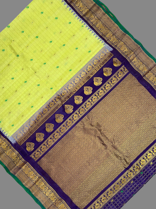 Humsa Big Checks Lime Yellow Pure Silk Saree
