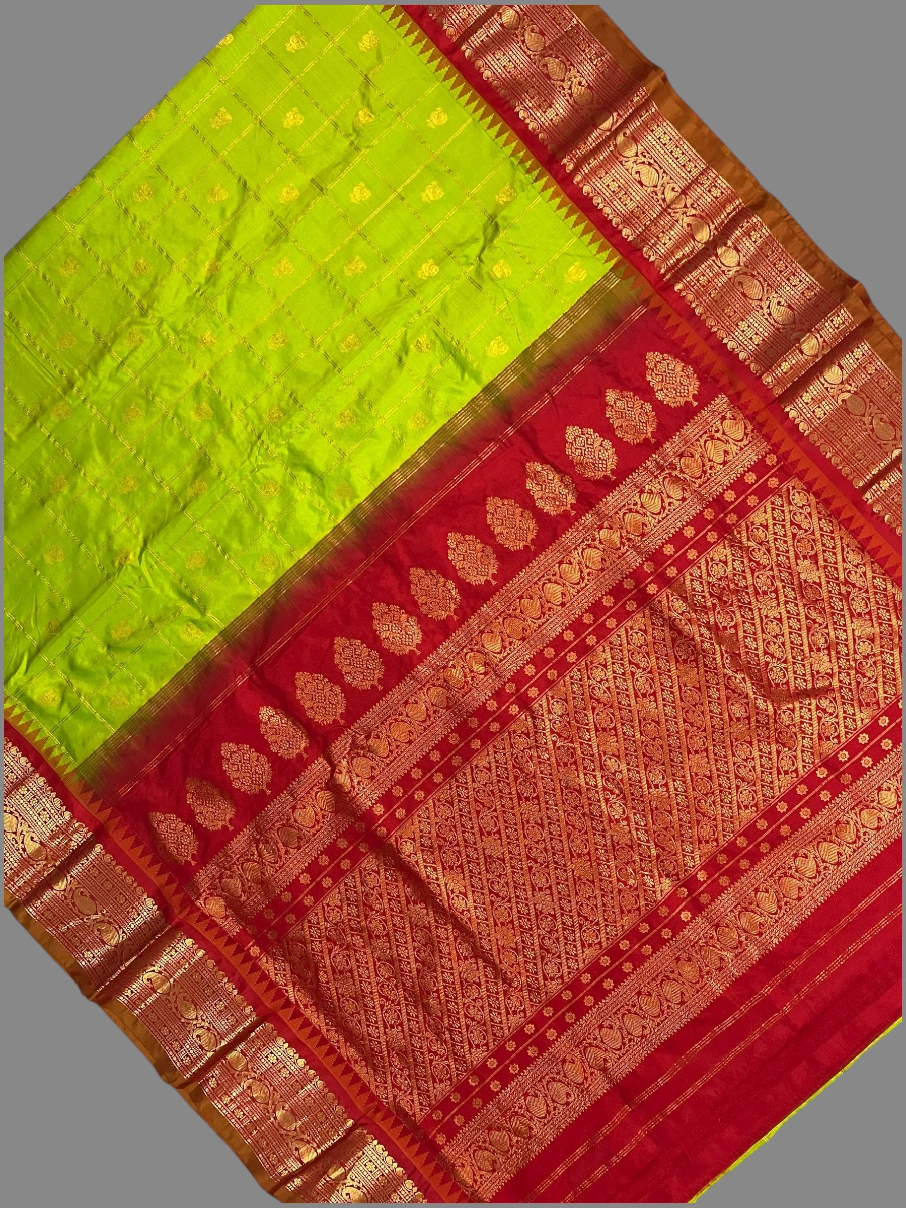 SAREE: Vibrant Kalanetha Parrot Green saree , enriched with zari intricate Checks & Butte design and zari borders that brings inner royalty.