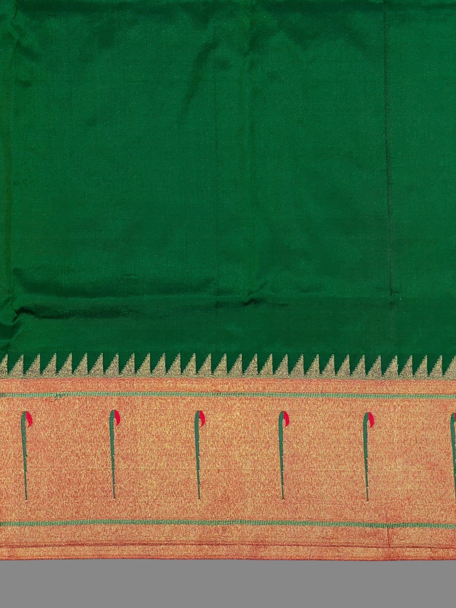 BORDERS : up : 6-7 inches ; lower : 6-7 inches Muniya paithani on either sides of the saree.