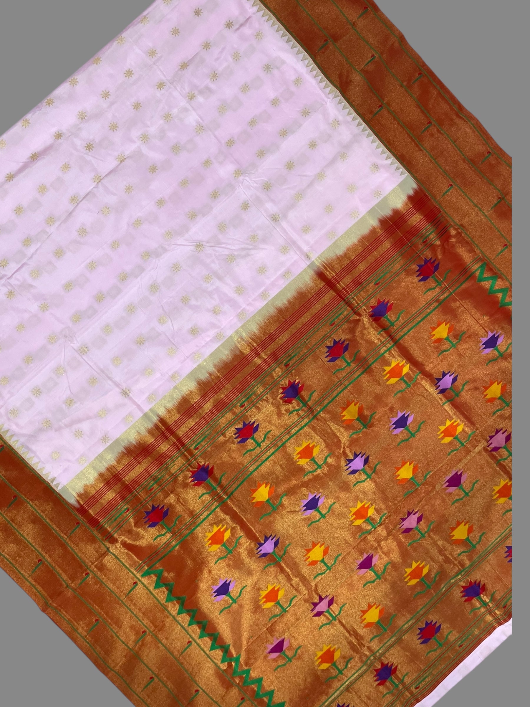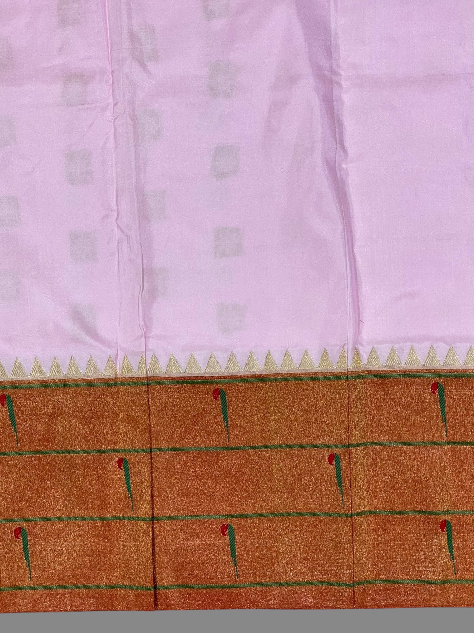 BORDERS : up : 6-7 inches ; lower : 6-7 inches Muniya paithani on either sides of the saree.