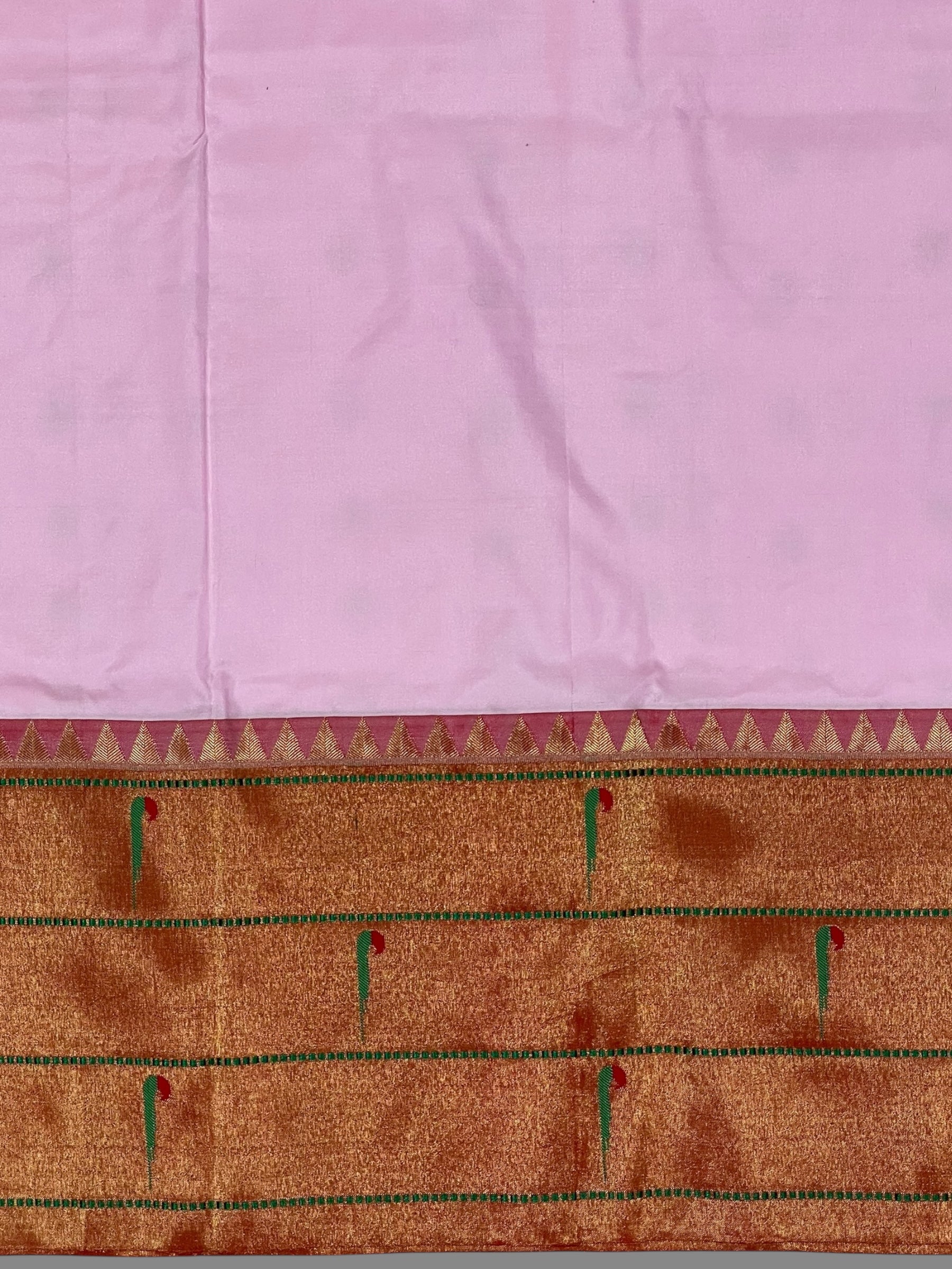 BORDERS : up : 6-7 inches ; lower : 6-7 inches Muniya paithani on either sides of the saree.
