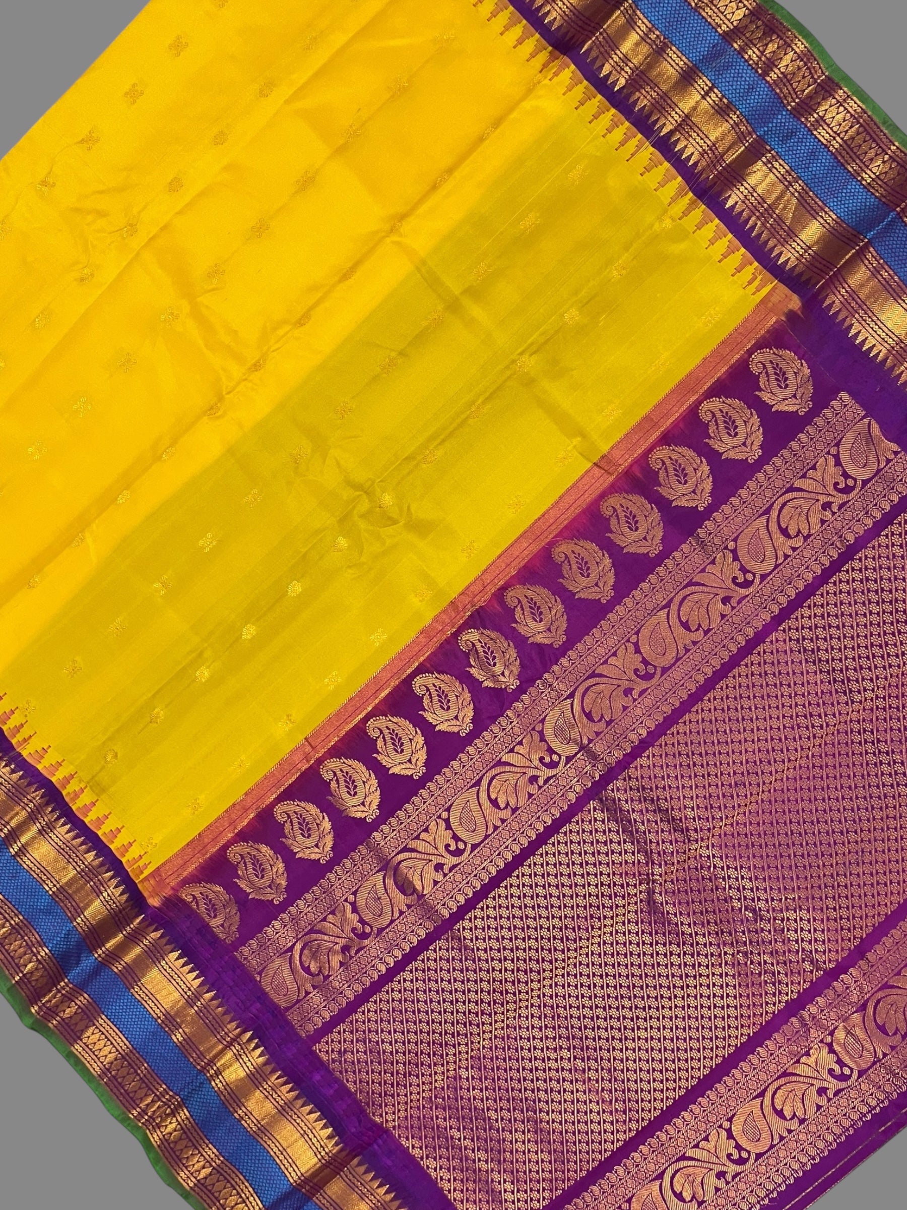 SAREE: Vibrant Kalanetha Yellow mix colour saree , enriched with zari intricate Butte design and zari borders that brings inner royalty.